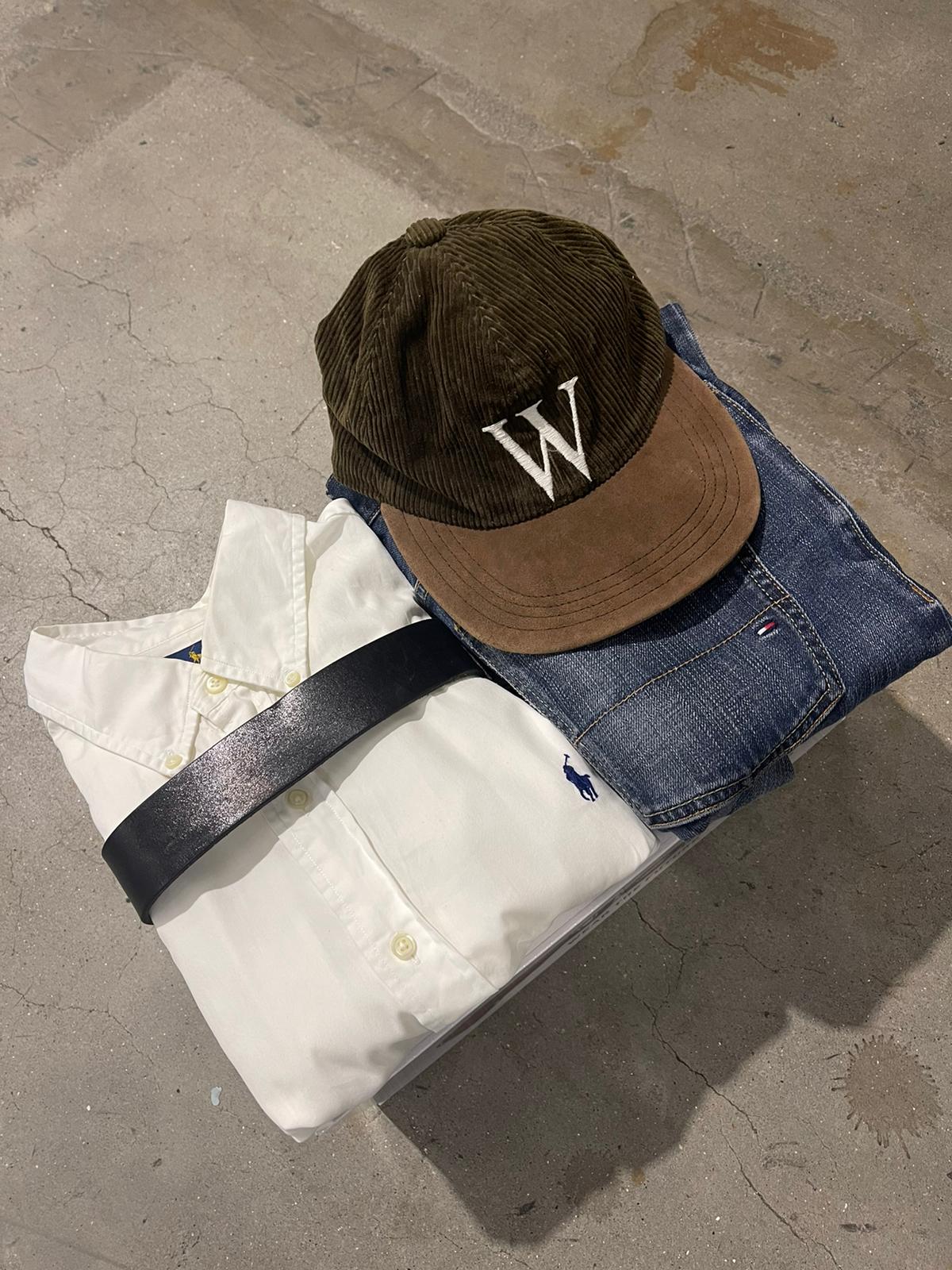 - 4-5 vintage clothing pieces, always including a top and a bottom.